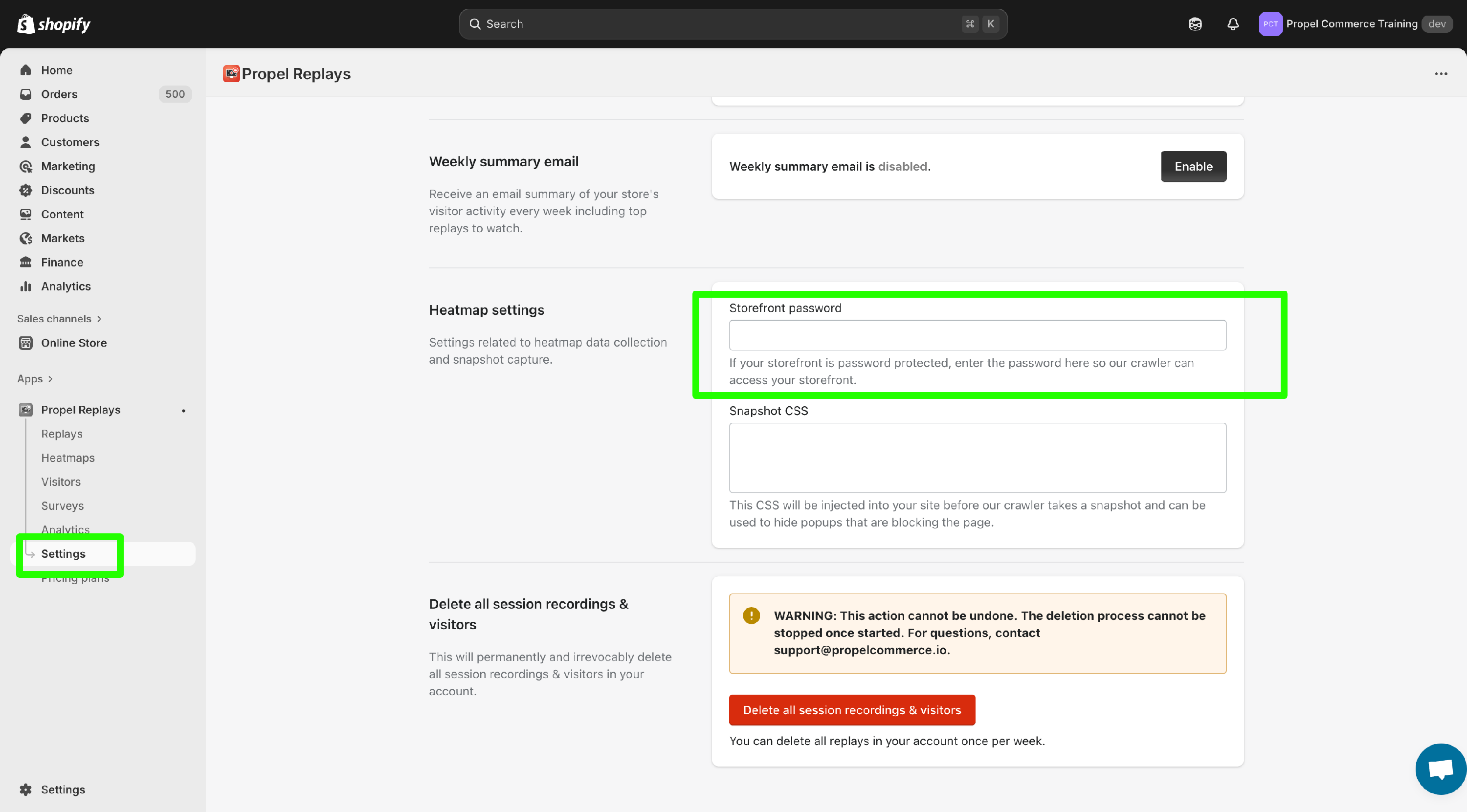 If your storefront is password protected, enter your storefront password in Settings —> Storefront Password. Our crawler will attempt to enter your password and bypass the password screen when building heatmaps for your store.